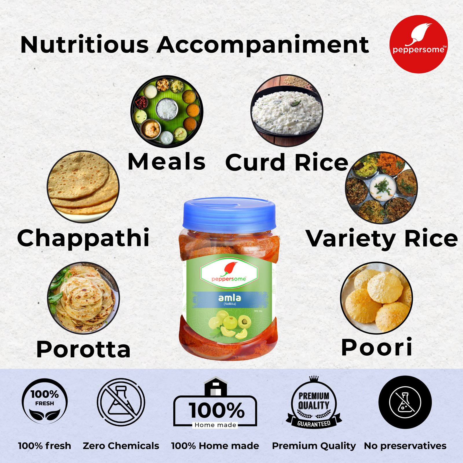 It differs in size, but all the variety of amlas can be pickled, it gives a different flavor and taste. Most important is that we collect fresh amlas for making pickles. We wash them and dry them with attention to get rid of moisture to make a perfect amla pickle. After that, the dried amla can be cut into pieces or can be pickled as a whole. All in all, the pickle is a perfect combination of hot steamed rice, Dosa, Chapathi, or Curd rice. At this point, the pickle gives you a punch of tasty, tangy taste to your taste buds.