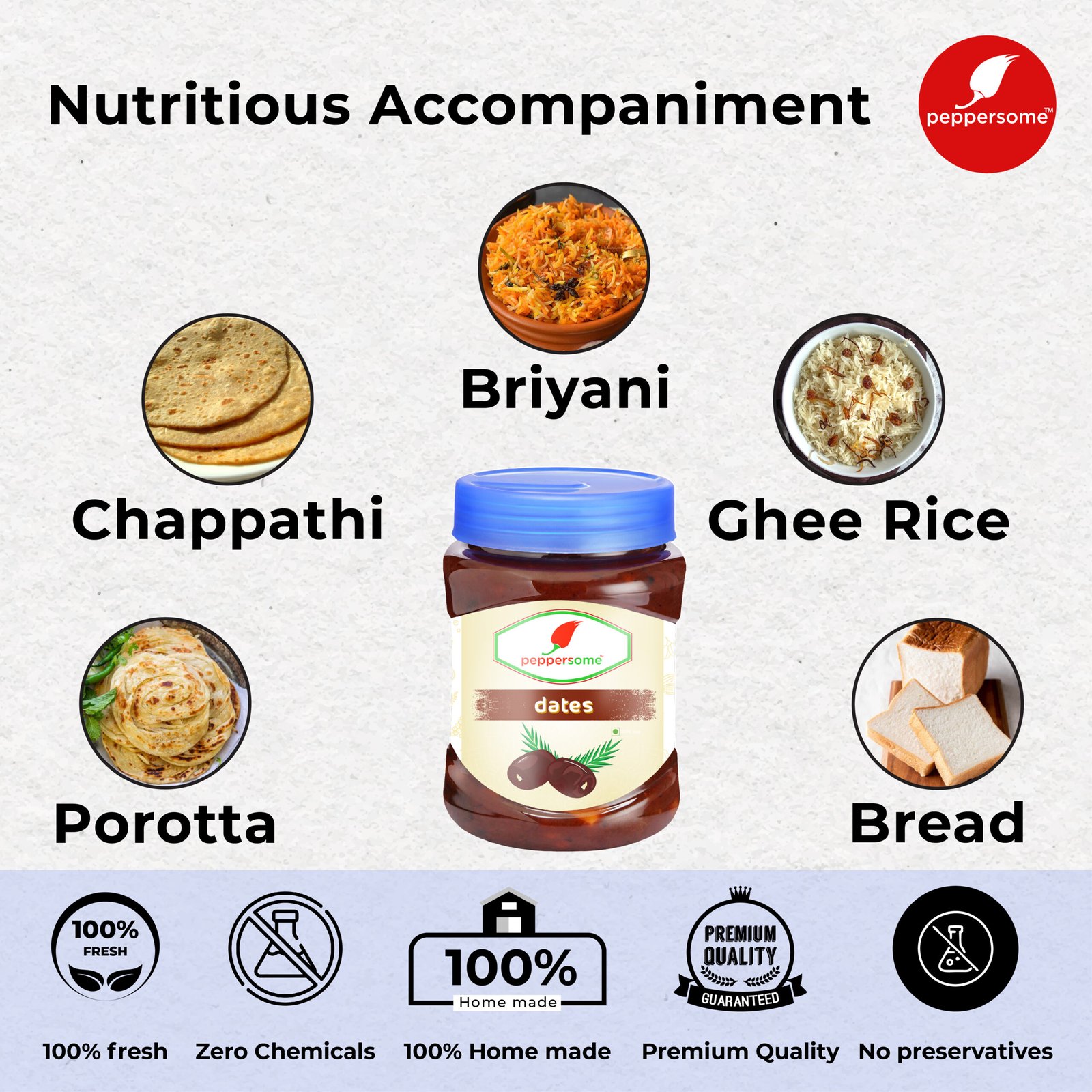 Dates pickle is a special recipe that lingers on our tongue for a long time. Because of its unique blend of sweet and salty flavors. Peppersome Dates pickle is a vegan pickle that’s gluten-free. Black dates, garlic paste, red chili powder, and ginger paste are used to make this tasty pickle. No artificial colors, flavors, or chemicals are used in the pickle’s preparation. You can serve this pickle with curd rice, hot rice, and paratha.
