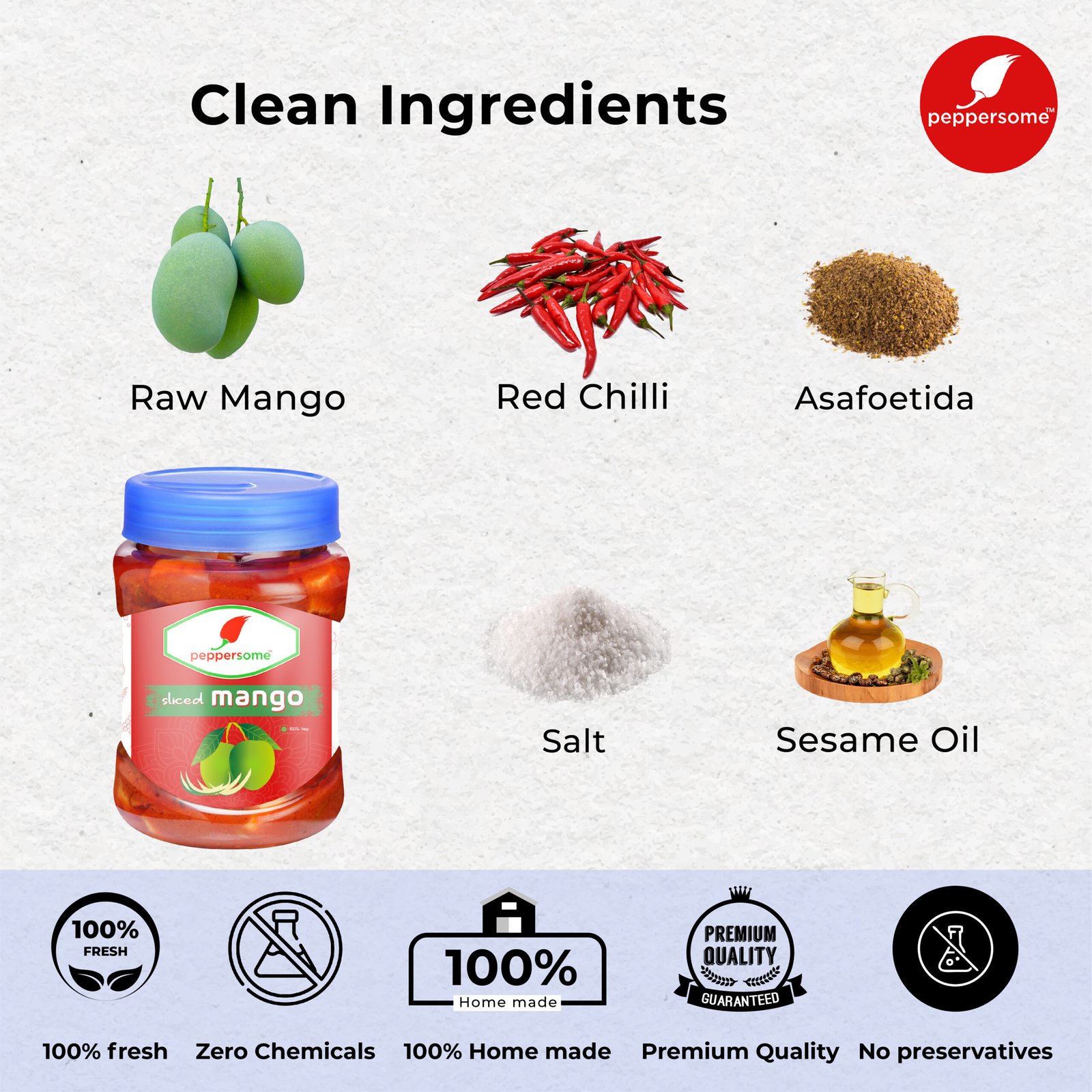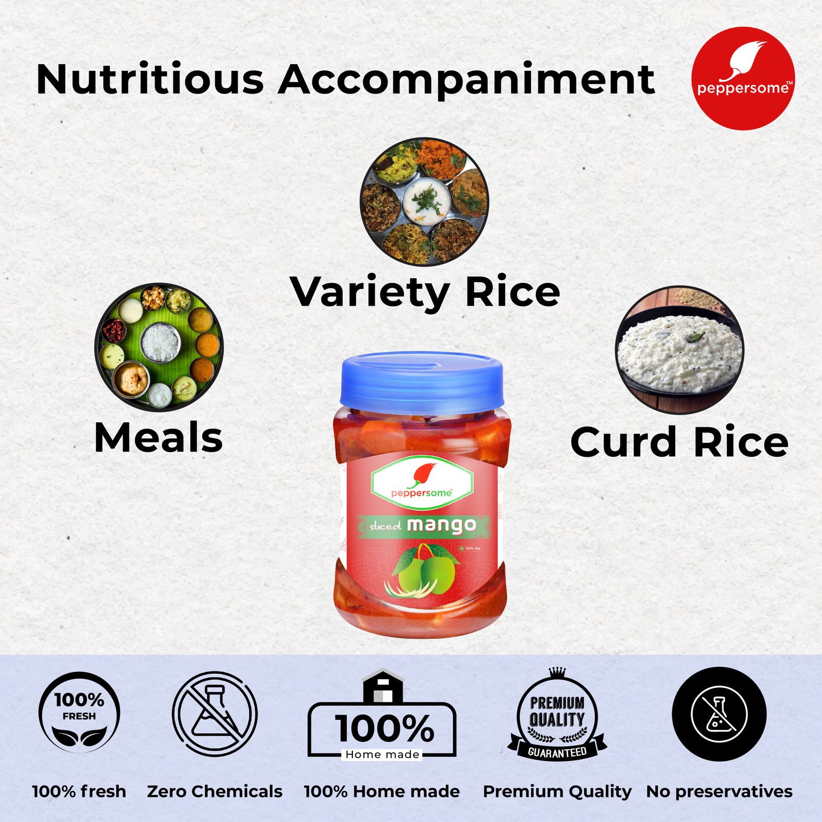 Even though, this pickle goes perfectly with banana leaf. Rice, is a full meal combo that is very famous in south India. Especially, adding jaggery to the pickle will give a unique sweet taste to the pickle. Furthermore, only a few varieties of mangoes are available throughout the year. After all, you can get this spicy and tasty mouth-watering sliced mango pickle at peppersome. Most important, we don’t use any preservatives. Slice mango Pickle is fully made up of natural ingredients.