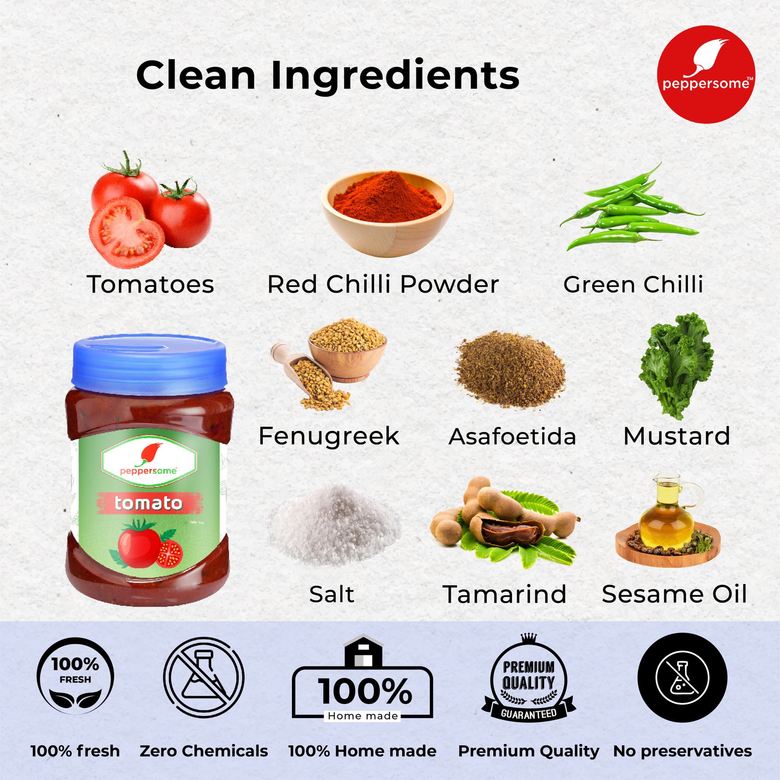 However, tomatoes used in our pickle are hand-picked carefully on season days. By that time, they ensure the quality, freshness, and Health of our customers. Formerly, we use authentic and Healthistic recipes which are suitable for all age category people. Especially, pickles offered in peppersome will give you a complete home feel.